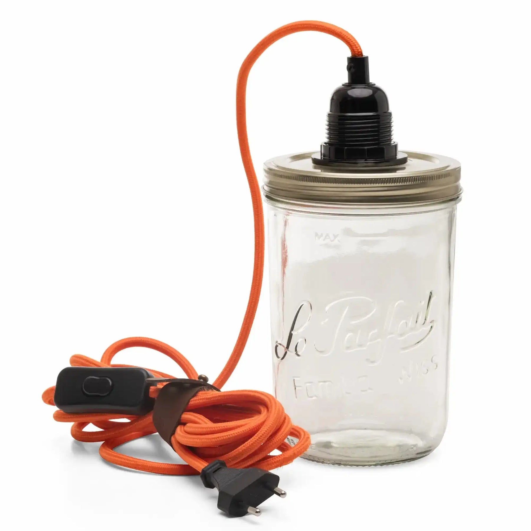 C'est super simple ! Le couvercle du bocal Le Parfait est déjà perforé, ce qui vous permet de brancher facilement l'ampoule et la bakélite directement sur le bocal.